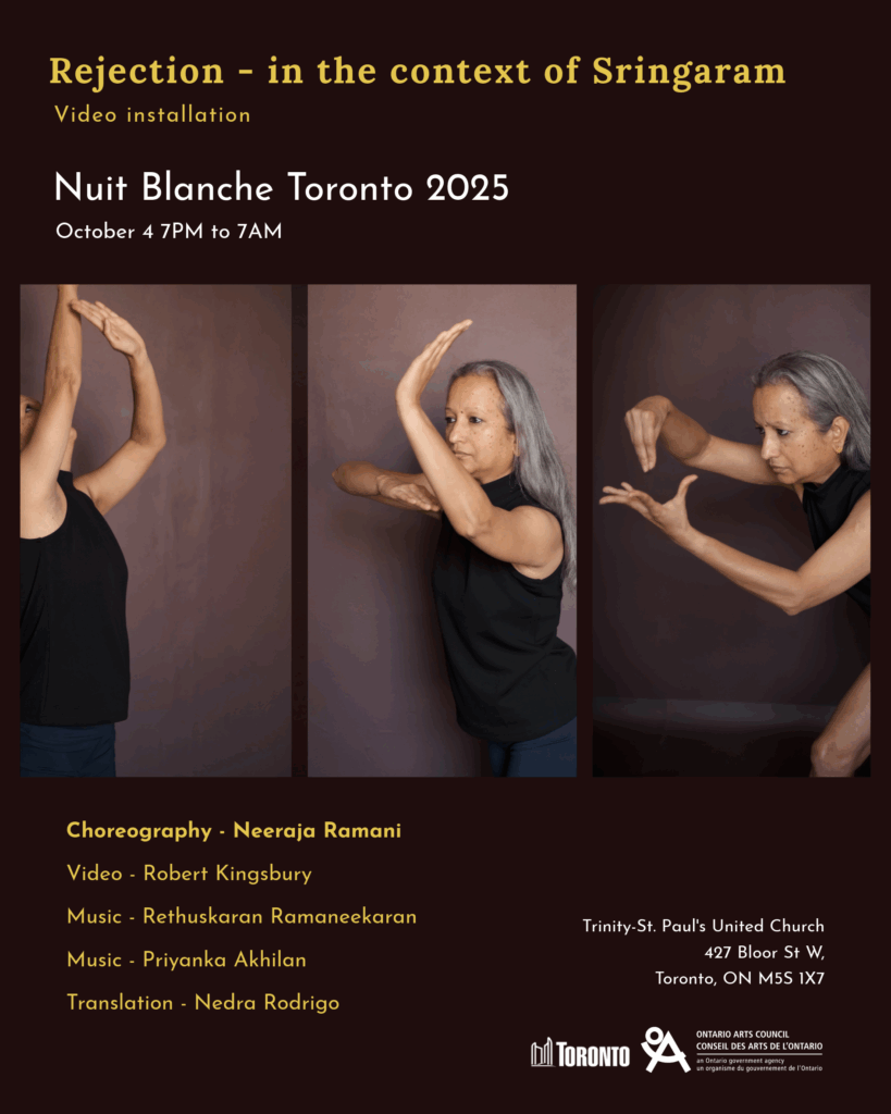 “Rejection – in the context of Sringaram” invites you to visually experience minimal movements extended in time, opening space for imagination through centred stillness and slowness of the body. This work explores the emotions that arise from separation in a relationship between two people. The movements on three different screens collectively interplay and disentangle the feelings of past and present, the rhythm of human relationship through the language of visuals and music. Inspired by Bharatanatyam’s rich tradition of expressive storytelling, the work explores the density of human relationships through music, facial expression, gestures, and repetition—revealing layered, sensitive emotions.